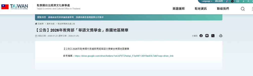 11 Feb 【115.2.11】【公告】2026年教育部「華語文獎學金」泰國地區簡章 華語消息 【公告】2026年駐泰國代表處教育組華語文獎學金泰國地區簡章:https://www.taiwanembassy.org/th/post/23335.html